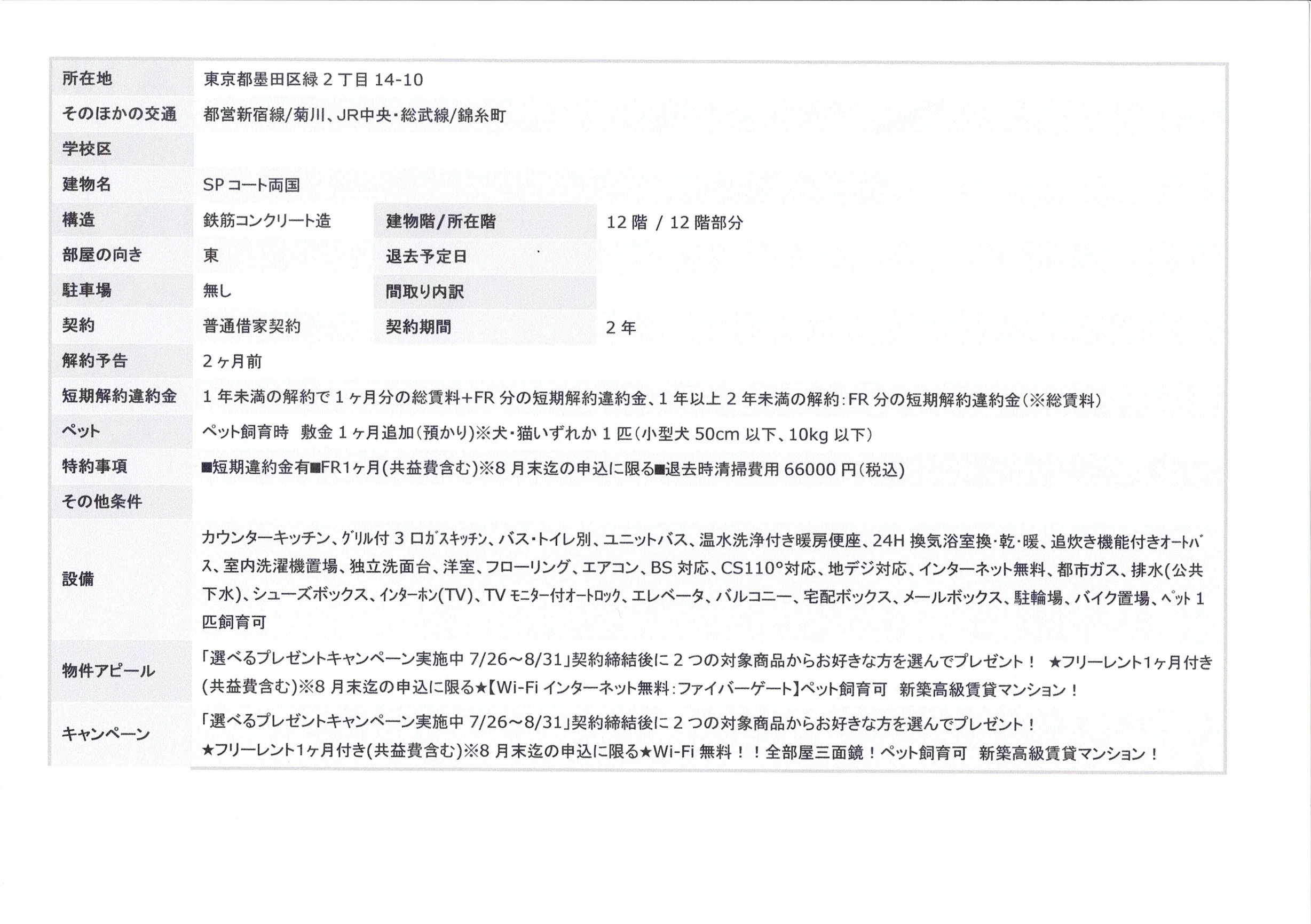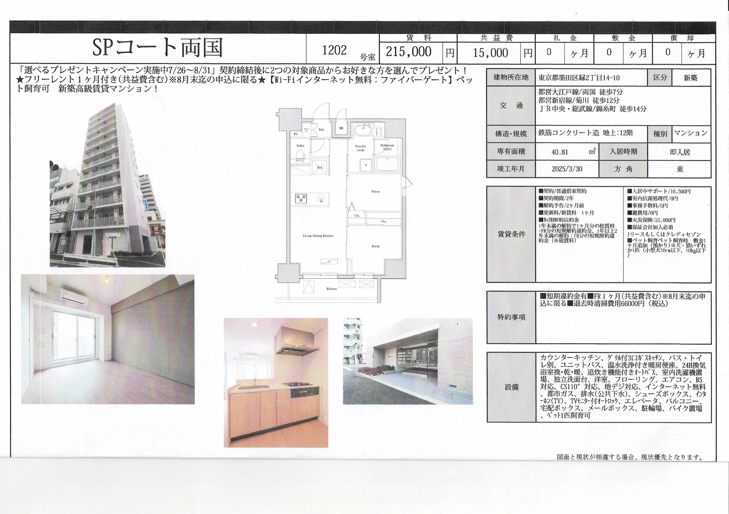 ●敷金・礼金0・0物件2件ご紹介します。ご興味あれがお問い合せください。他に様々な物件がありますので気兼ねなくお問い合せください。No.1 墨田区緑2丁目の物件です。賃料:21.5万円 管理費等:15,000円(合計:23万円/月)・交通 都営大江戸線 / 両国 ・徒歩 7分 ・敷金(保証金) 0.00万円 ・礼金 0.00万円 ・専有面積 40.81m2 ・築年月(築年数) '25/3(築0年)・取引態様 一般媒介 No.2 台東区浅草橋5丁目の物件です。敷金・礼金0・0物件。賃料:32.7万円 管理費等:20,000円(合計:34.7万円/月)・交通 JR中央・総武線 /浅草橋・徒歩 7分・敷金(保証金) 0.00万円 ・礼金 0.00万円 ・専有面積 53.21m2・築年月 '23/12 ・取引態様 一般媒介
