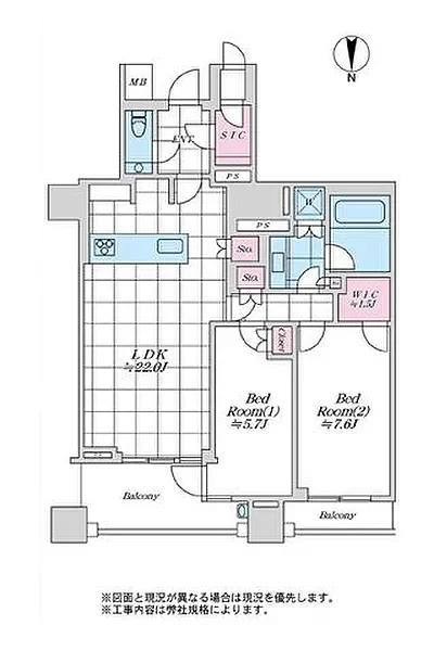 間取り:2LDK(リビングダイニングキッチン 22帖 洋室 7.6帖 洋室 5.7帖)