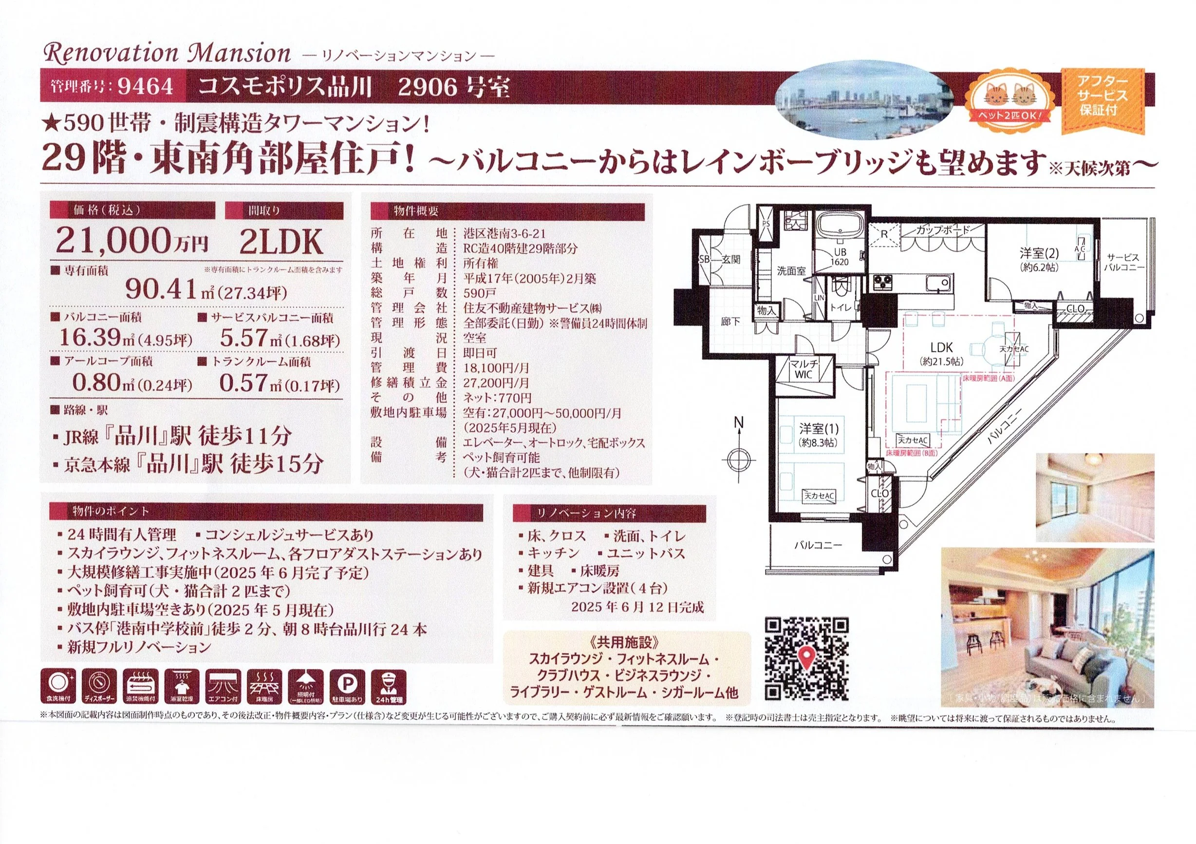 コスモポリス品川 2906号室★590世帯・制震構造タワーマンション!★29階・東南角部屋住戸! ~バルコニーからはレインボーブリッジも望めます ※天候次第~価格:21,000万円(税込)面積/間取:り90.41㎡ / 2LDK所在地 :東京都港区港南3丁目6-21アクセス :【路線1】山手線 品川駅 徒歩11分