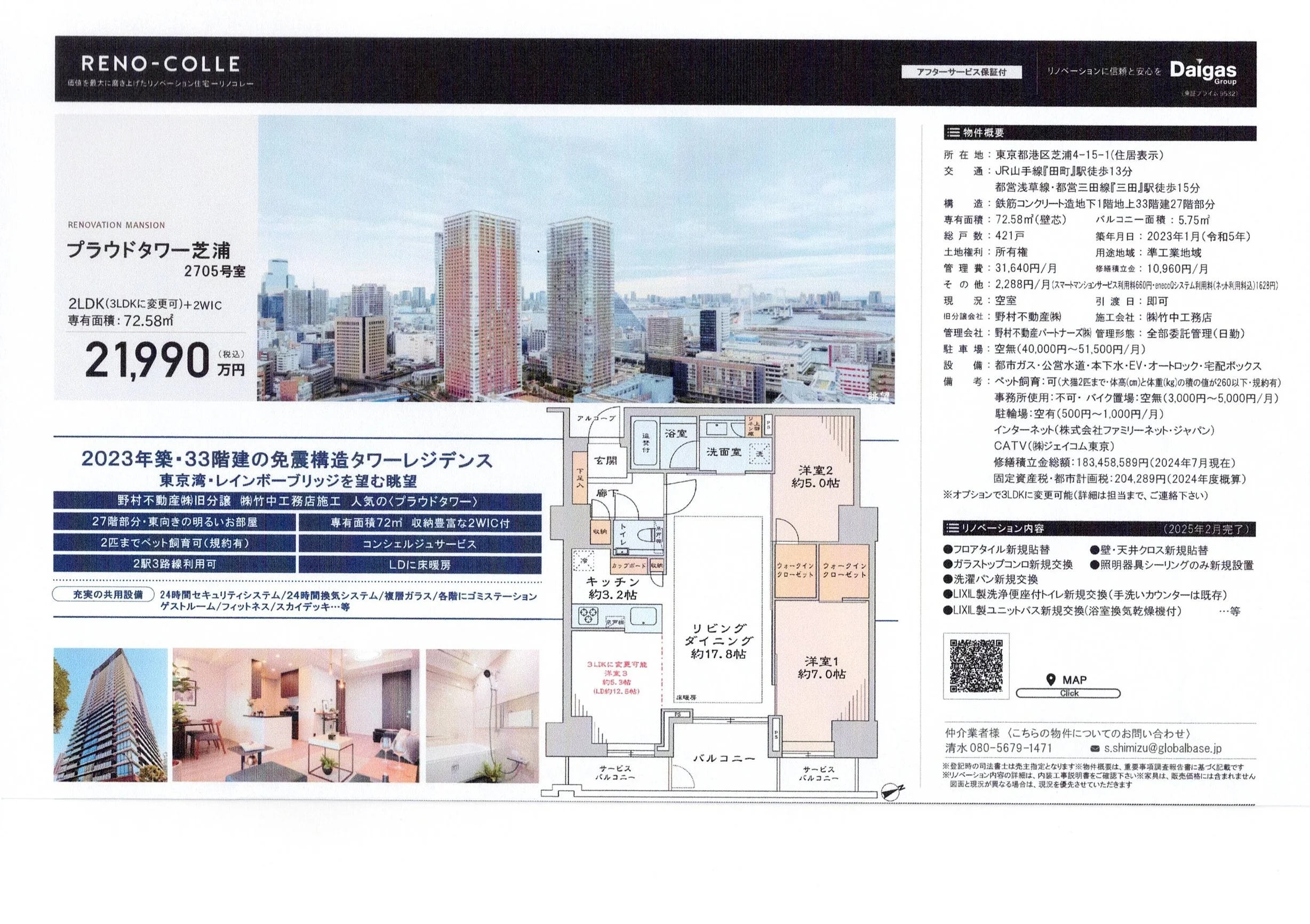 No.5 プラウドタワー芝浦 2705号室価格21,990万円2023年築・33階建の免震構造タワーレジデンス東京湾・レインボーブリッジを望む眺望27階部分・東向きの明るいお部屋所在地 : 東京都港区芝浦4-15-1交通 : JR山手線『田町』駅徒歩13分都営浅草線・都営三田線『三田』駅徒歩15分間取り : 2LDK+2WIC専有面積 : 72.58 ㎡取引態様:一般媒介